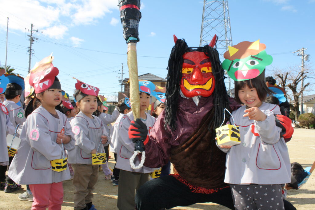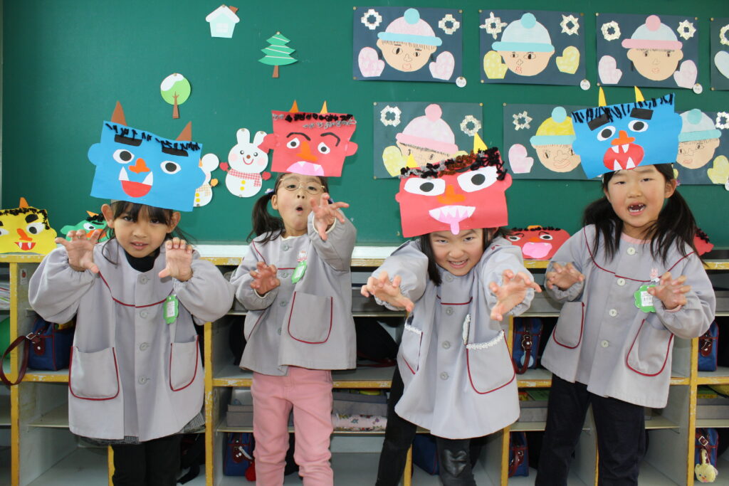 幼稚園では節分が近づくと、みんなで節分の歌を歌い、鬼のお面製作が始まります。