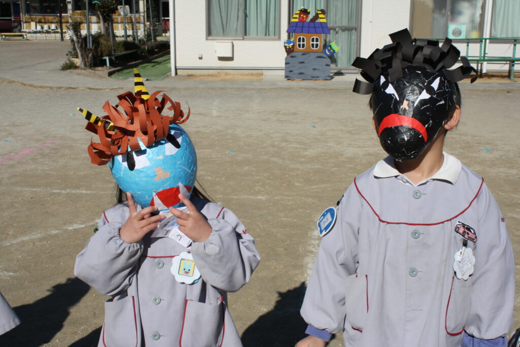 子ども達は自分のお面をつけて、「鬼はそと、福はうち」と大きな声で豆まきをして楽しみました。